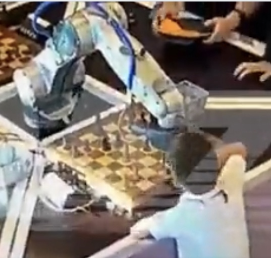 A chess-playing robot took enforcement a bit too seriously at a recent tournament in Moscow. Facing a 9-year old human opponent, the robot grabbed and broke the boy’s index finger when the boy reached toward the board when it was the robot’s turn to move. When you’re a robot, rules are rules.